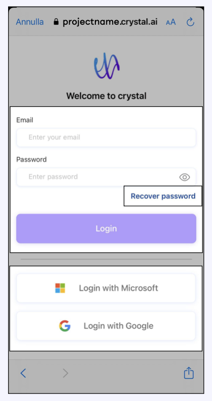When you reach the Login Page, either on the web or mobile app, you will be able to log in to Crystal in one of two ways, depending on the invitation process that your Admin picked for you.
