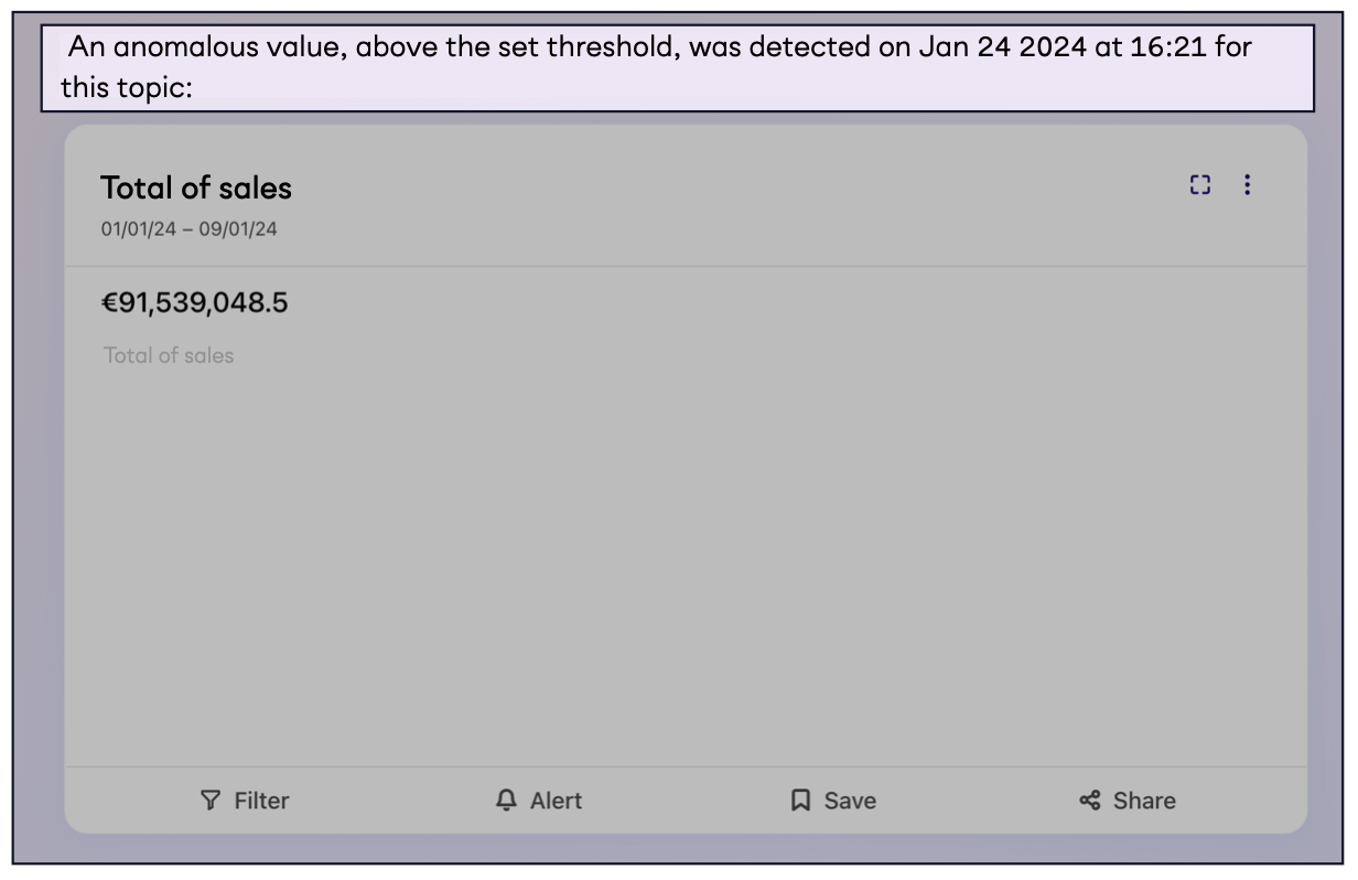 Alerts are filter-sensitive, meaning that if the monitored Topic includes Dynamic Filters, it will be added to the Alert (however, this is not true for Time Range!)