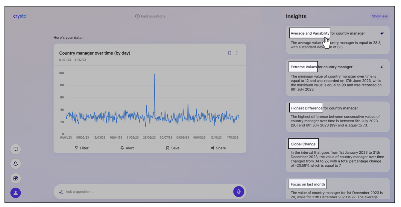 Therefore, whenever you ask about a specific Topic, Crystal detects the type of Objective / Visualization, and from the list of related Insights available, calculates as many applicable Insights as possible based on the specific data underlying the Topic.&#x20;