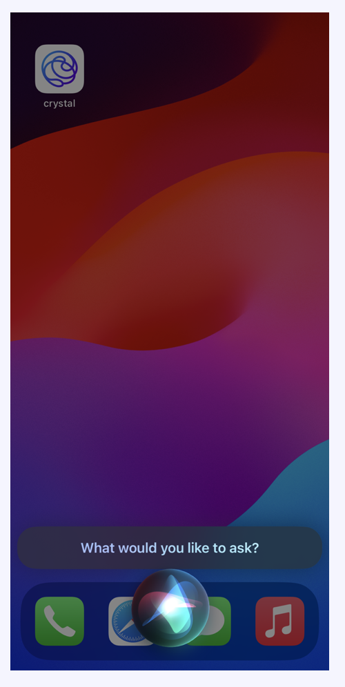 <figure><img src="https://2516160394-files.gitbook.io/~/files/v0/b/gitbook-x-prod.appspot.com/o/spaces%2FmAOqTQkYofJrevcpklA7%2Fuploads%2F0KzwBabXTwkCNkD45wWc%2FScreenshot%202024-02-29%20at%2011.15.46.png?alt=media&#x26;token=cd9b793f-5fa6-4696-a659-02f1b5846ce6" alt="" width="250"><figcaption><p>Ask Siri to Ask Crystal</p></figcaption></figure>