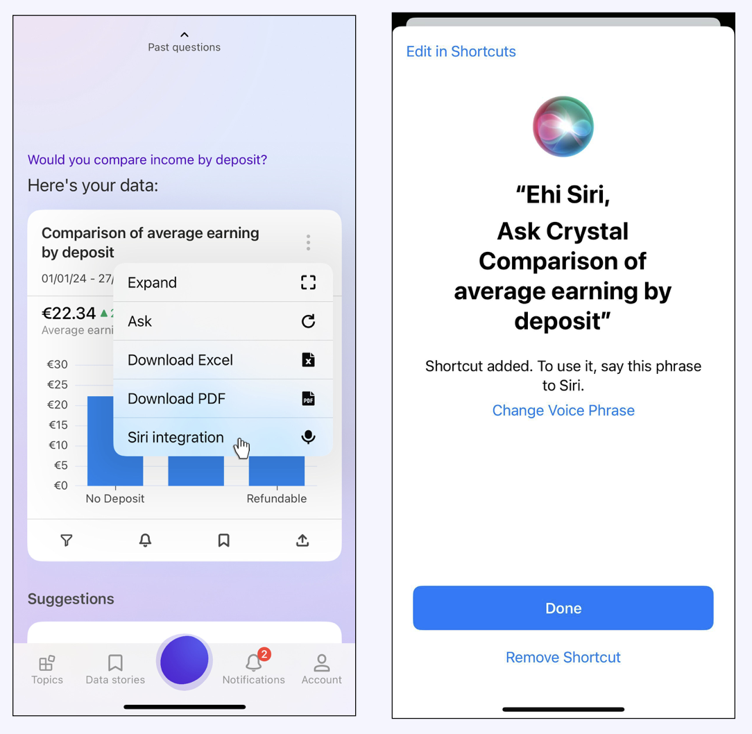 You can integrate your Crystal app with the **iOS Virtual Advisor "Siri"** and with the **iOS app "Shortcuts"**.