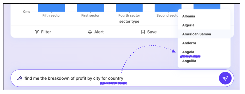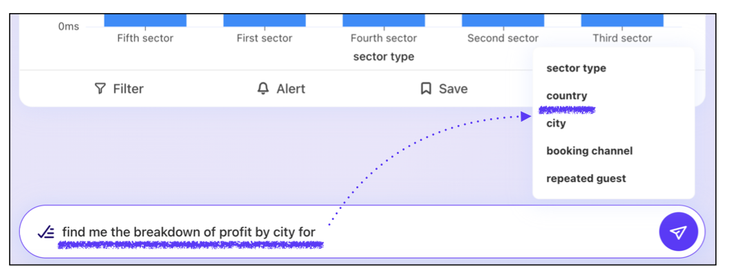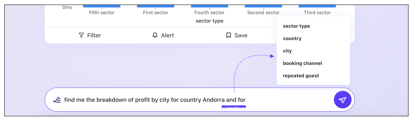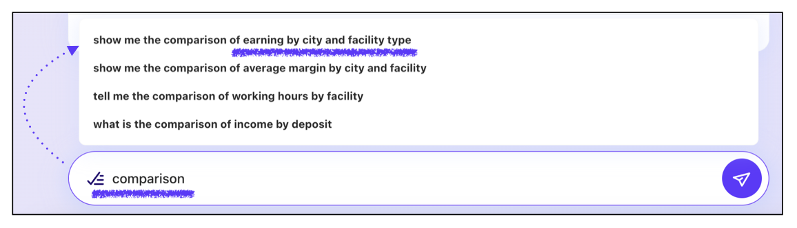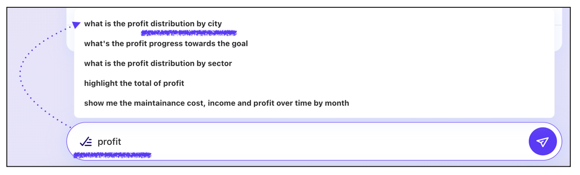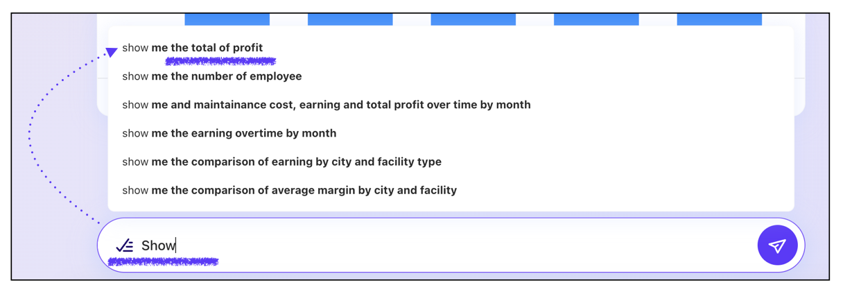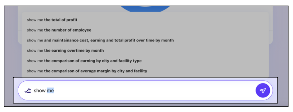 While talking to your data, **proactive suggestions of words and phrases** will appear in the Conversational Bar as you type.