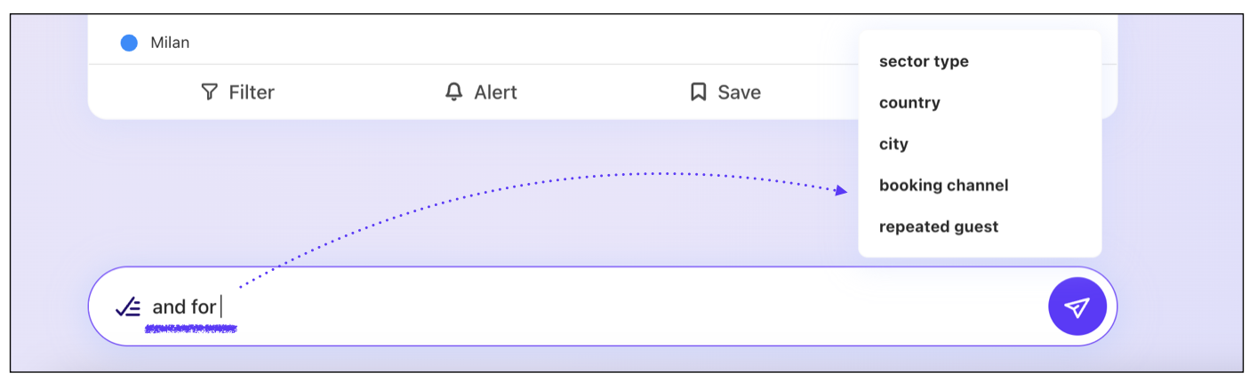 Crystal will also suggest Filters and their values **when concatenating Filters**, i.e. when you write *“and for”* in order to add a Filter to an already-filtered Topic.