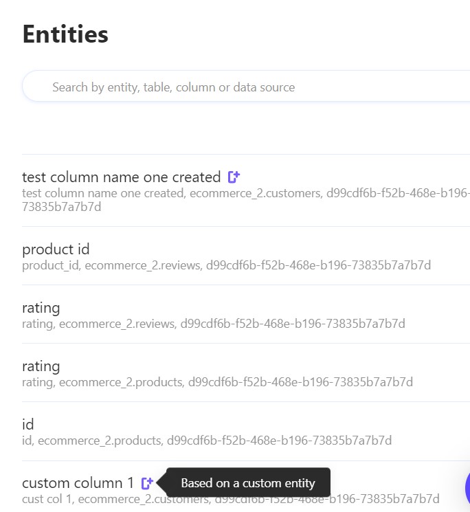 Under the entity name, there are specific details: the original column name, the table name, and the data source name from where it comes. When searching for a specific entity, to help narrow it down, you can search by any of these details.