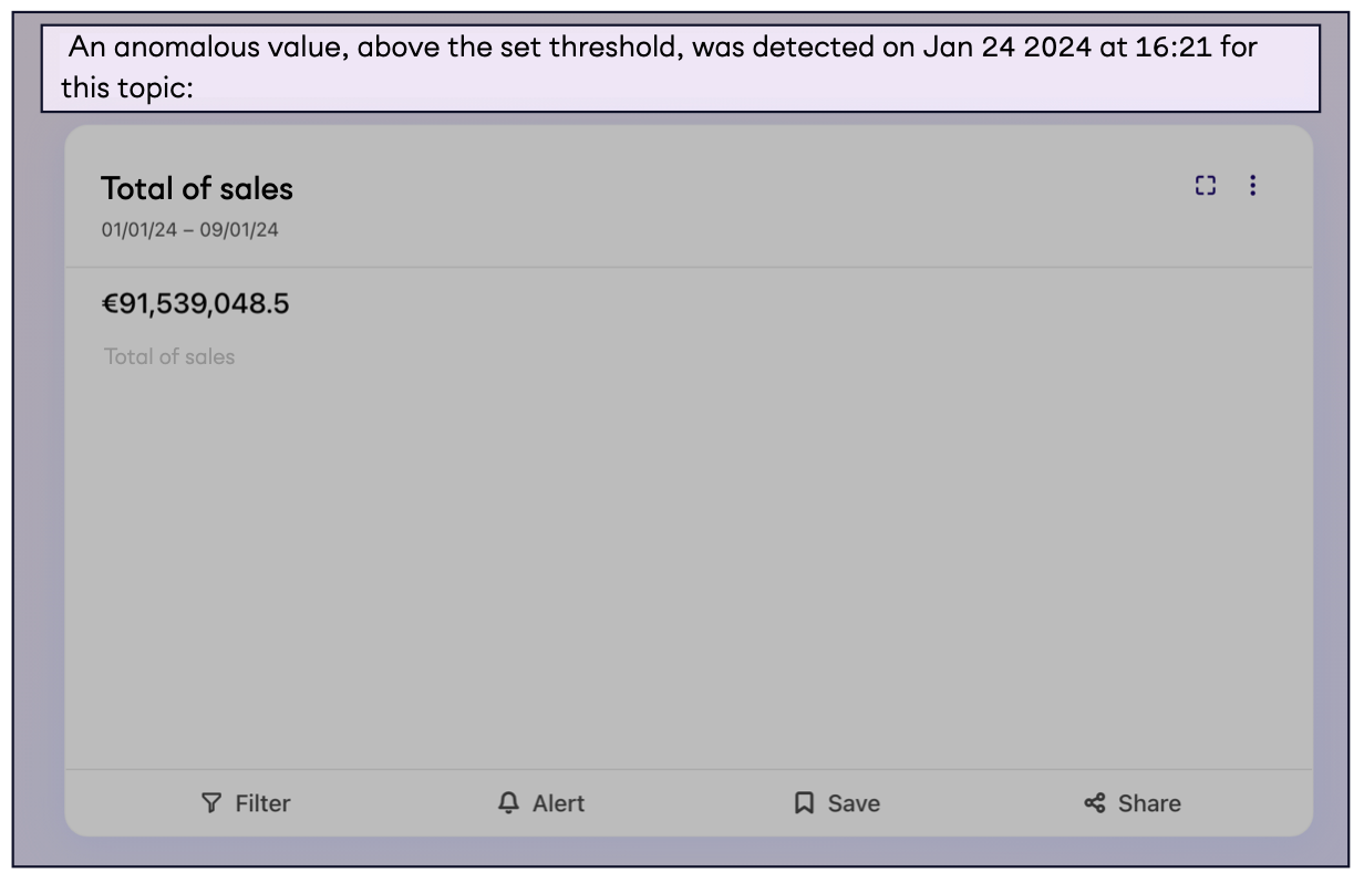 3. ora vedrai il Topic monitorato con un messaggio introduttivo che descrive *quando e come i valori hanno raggiunto la soglia*: leggi il testo ed esplora l'analisi!