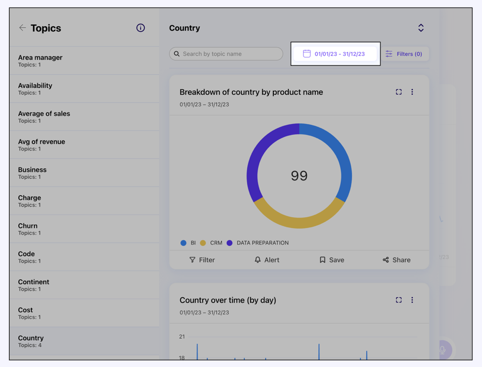 In alto a destra della sezione Topic, troverai il pulsante di Filtro Temporale che mostra la data di *inizio* e la data di *fine* attualmente applicate all'elenco dei Topic.