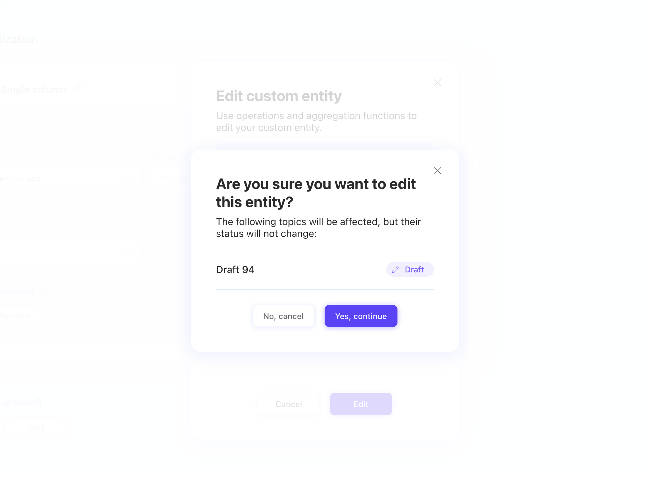 N.B.: quando modifichi un'entità personalizzata, un messaggio ti avviserà sui topic che saranno influenzati dalla modifica. Il loro stato non cambierà: