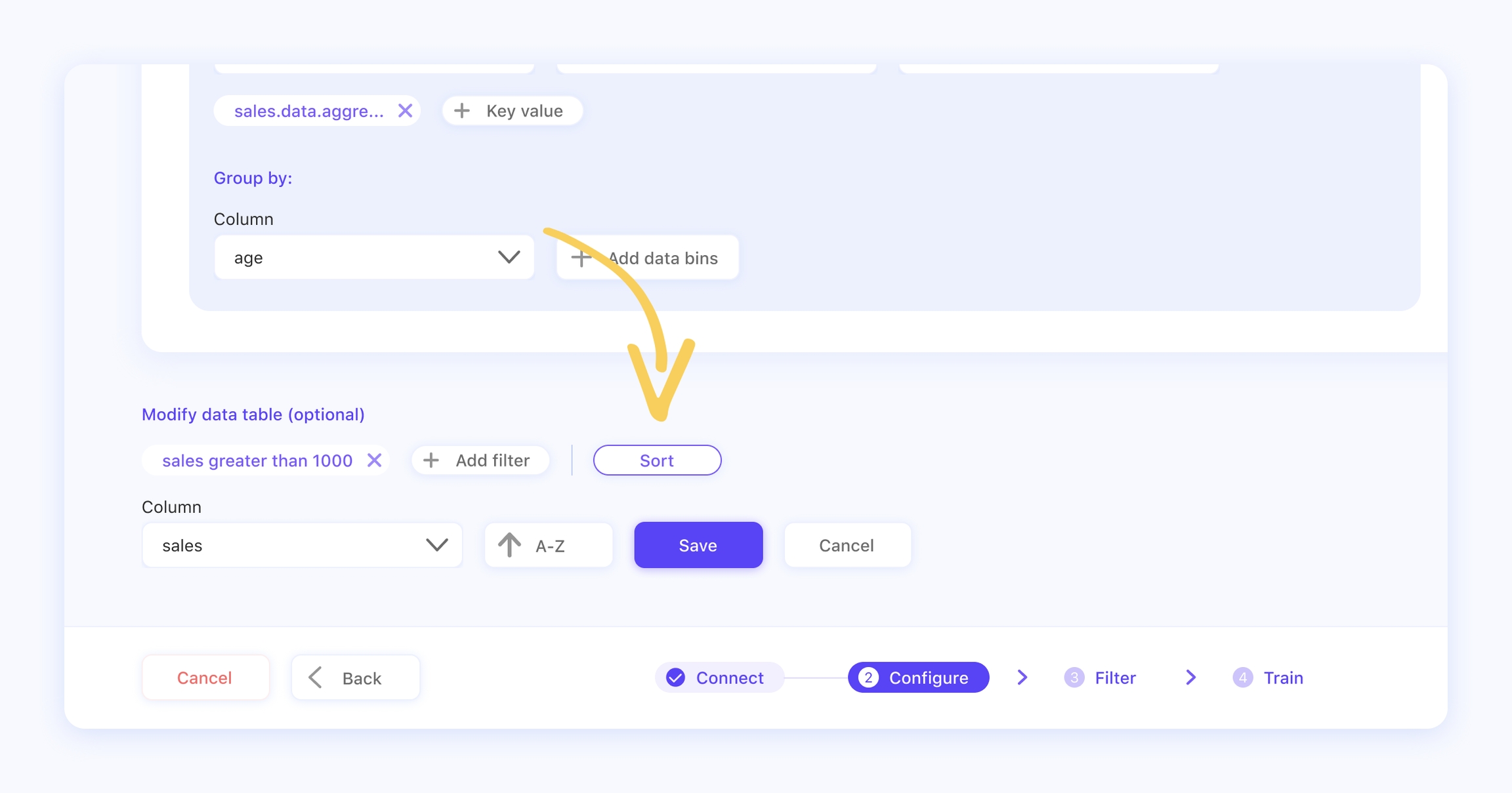 Durante la fase di configurazione del topic è possibile modificare la tabella dati aggiungendo filtri statici o avere la possibilità di mettere in ordine i dati per ottenere insight più precisi.