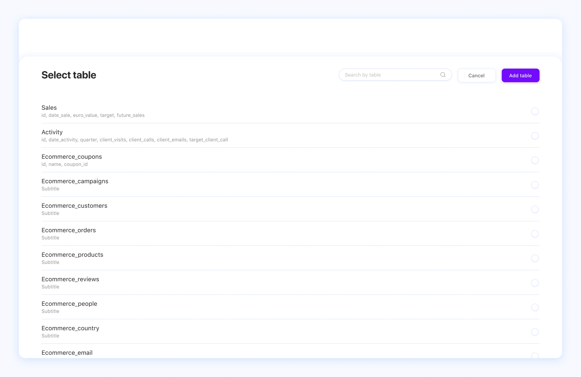 Una volta fatto, i fogli di Google Spreadsheets che hai condiviso con client email saranno mostrati nella collezione di tabelle nel primo passo della topic creation.