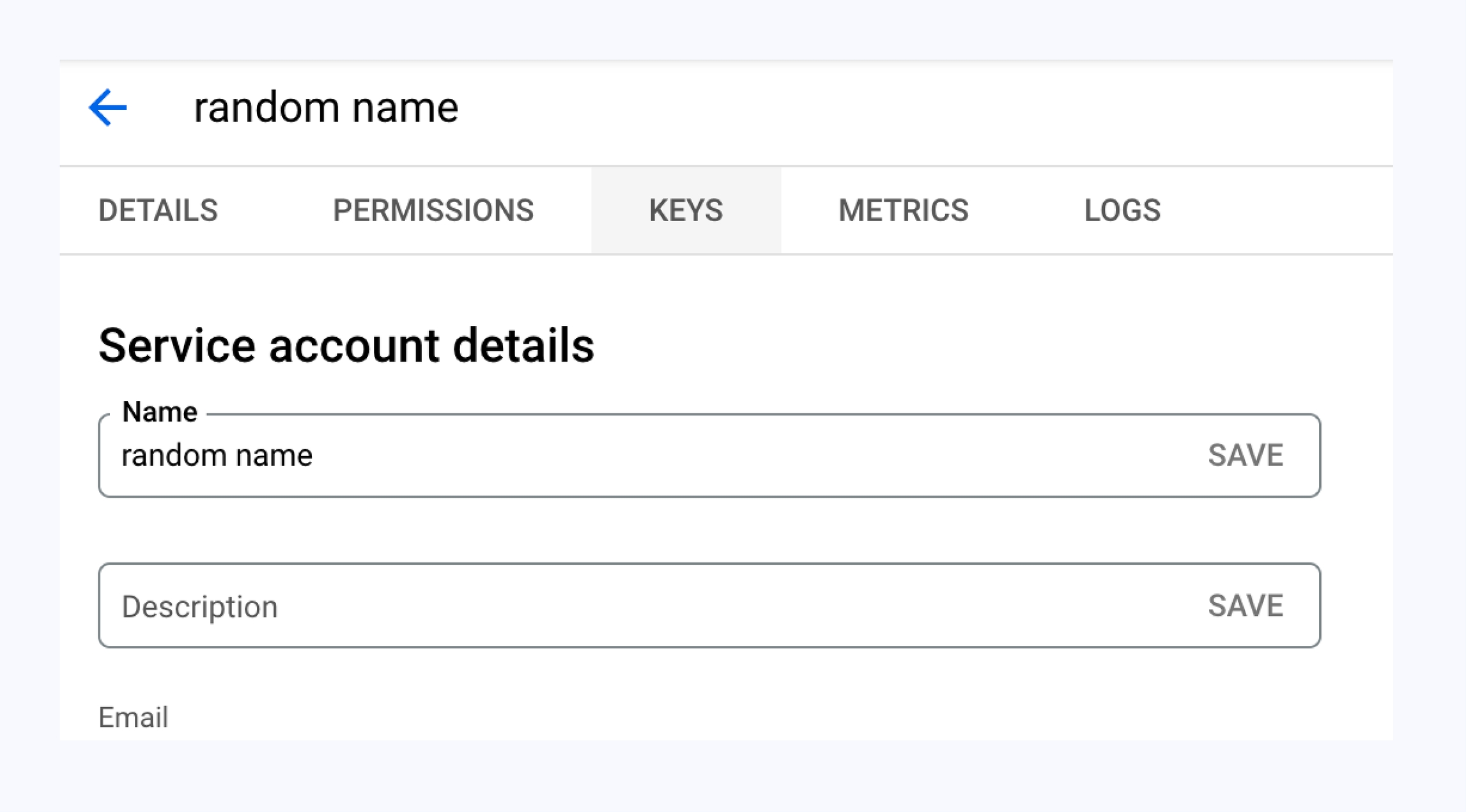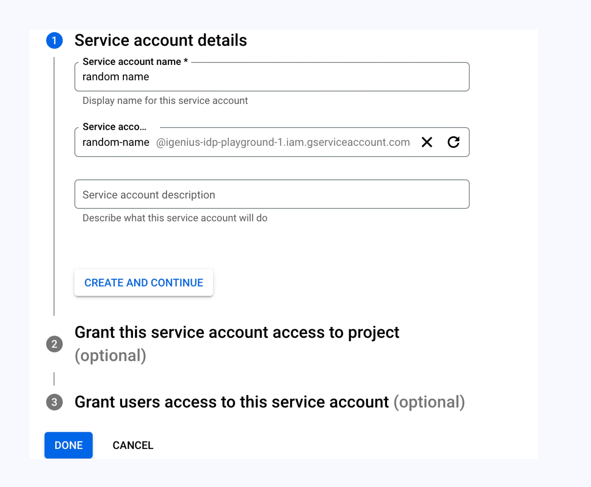 Nel modulo aperto compila il Service account name, poi clicca su Create and continue e continua la configurazione saltando tutti i passi opzionali.