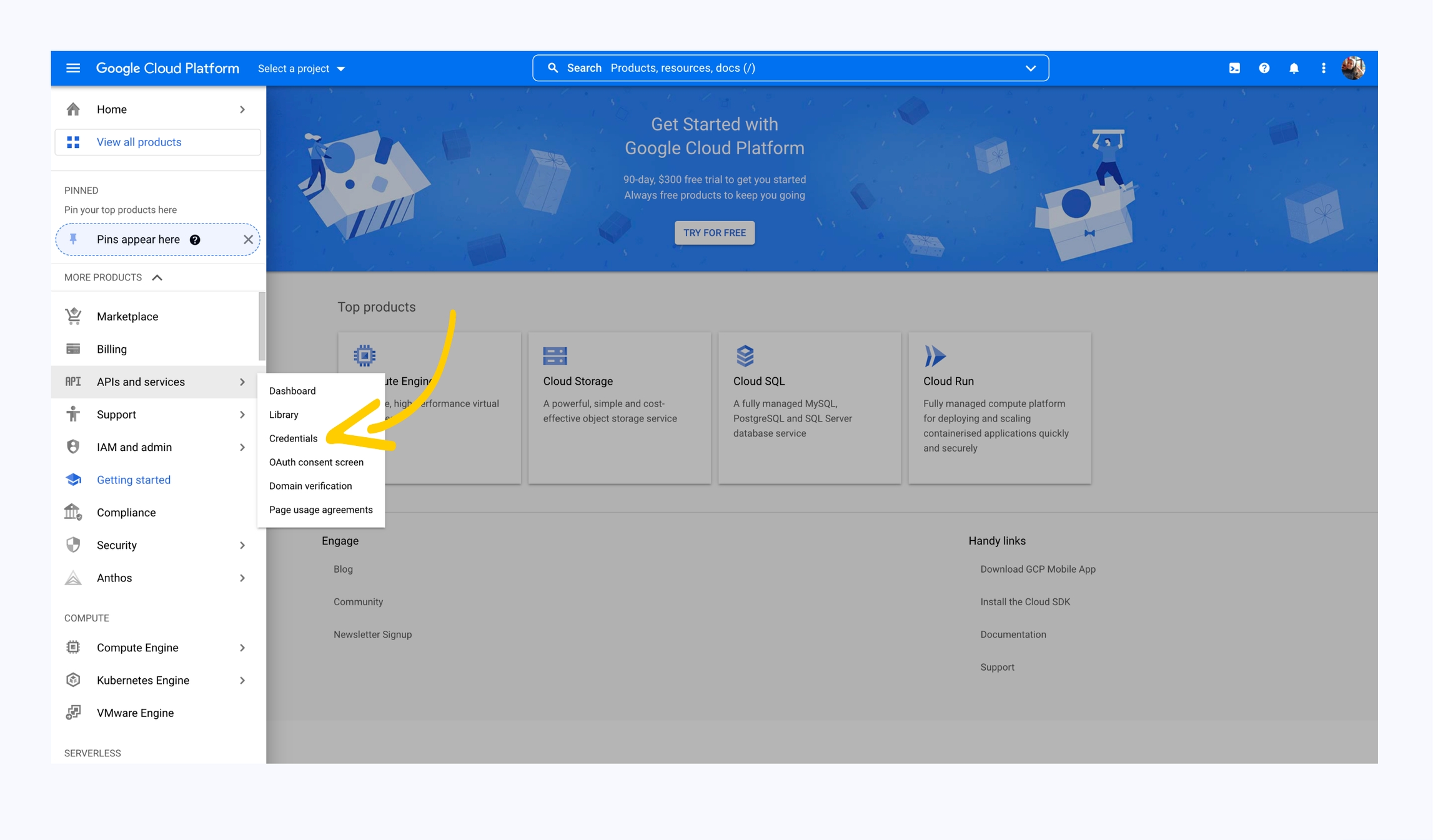 Accedi alla Console GCP e assicurati di selezionare il progetto corretto. Dal menu della barra laterale, seleziona APIs and services e poi seleziona Credentials.