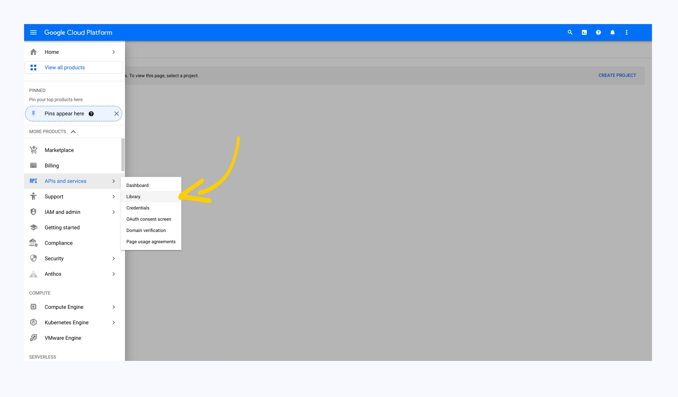 Accedi alla piattaforma Google Cloud e vai alla console GCP. Seleziona il relativo progetto GCP e poi nel menu laterale sinistro della console GCP seleziona APIs and Services e poi Library.
