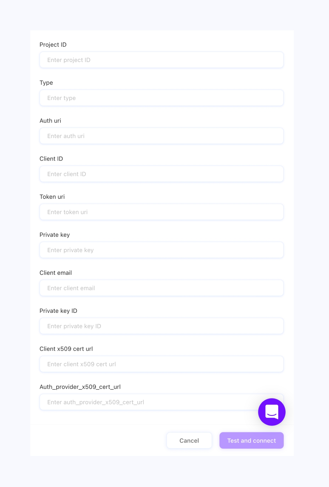 Per compilare i campi nel menu aperto, avrai bisogno del file dell'account di servizio scaricato in precedenza. Apri il file JSON e metti le informazioni all'interno del modulo, poi clicca su Test and connect.