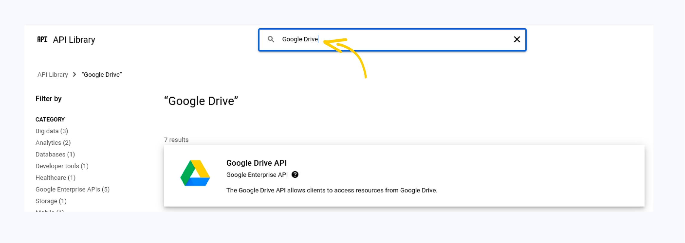 Una volta attivata l'API di Google Sheets, torna alla ricerca, cerca Google Drive e seleziona Google Drive API.