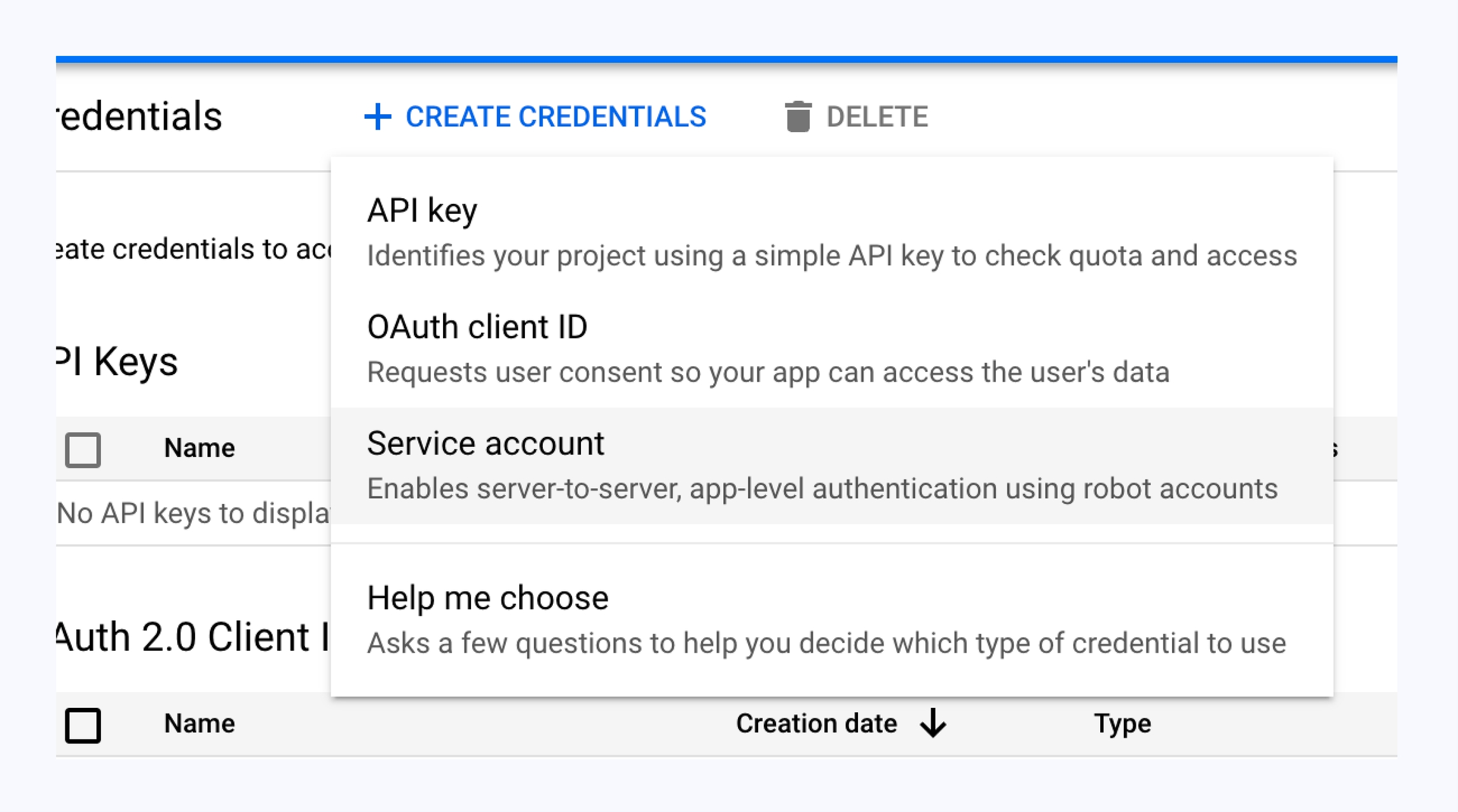 Dal menu in alto, seleziona Create Credentials e poi scegli l'opzione Service Account.