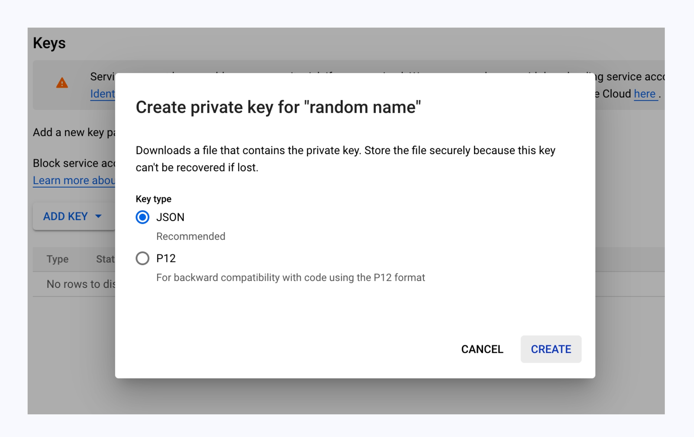 Nel menu aperto seleziona il formato JSON e poi clicca su Create. Questo scaricherà automaticamente il file dell'account di servizio JSON necessario per la seguente configurazione con crystal.