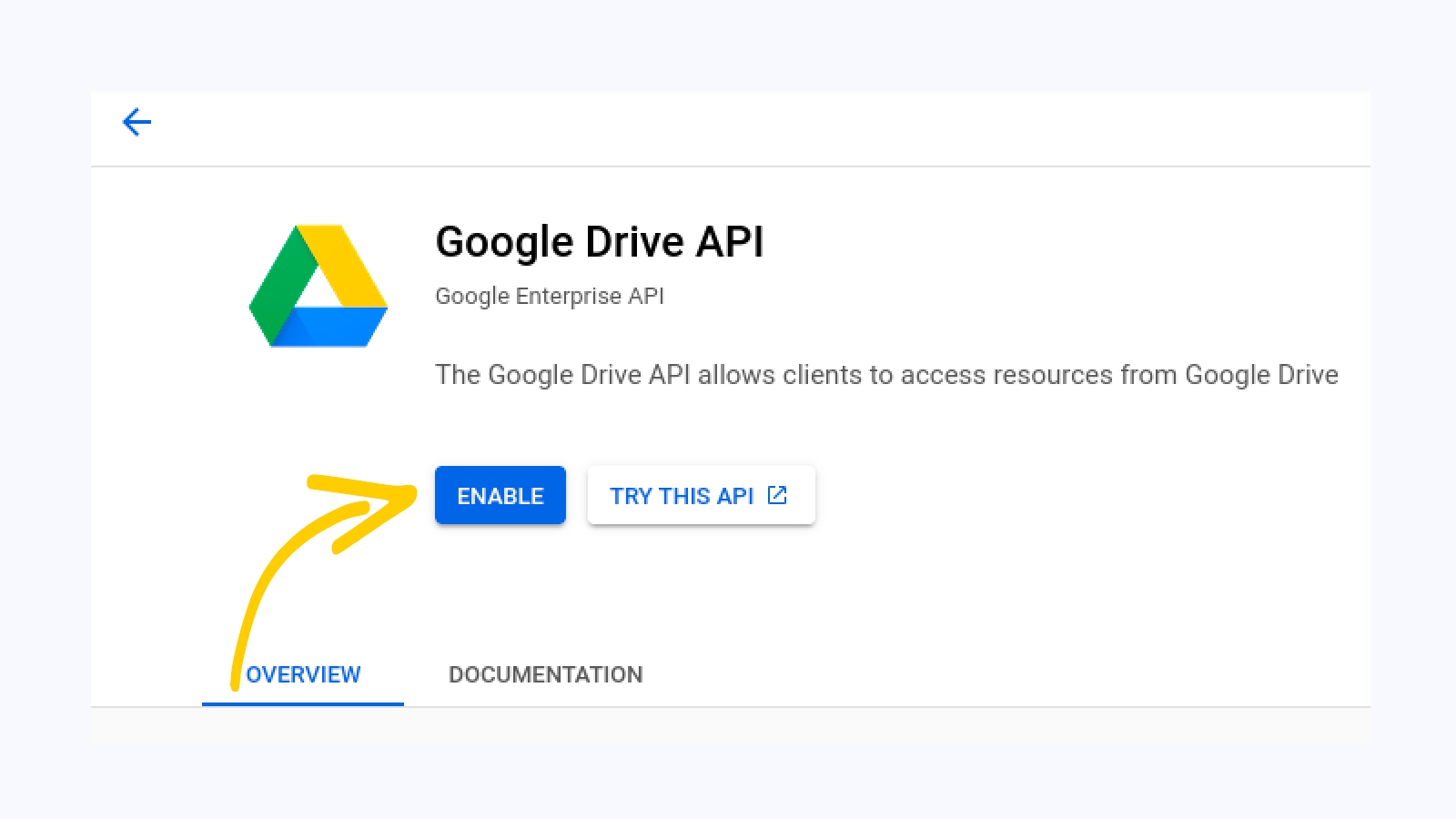 Clicca su Enable per attivare l'API di Google Drive per il progetto corrente.