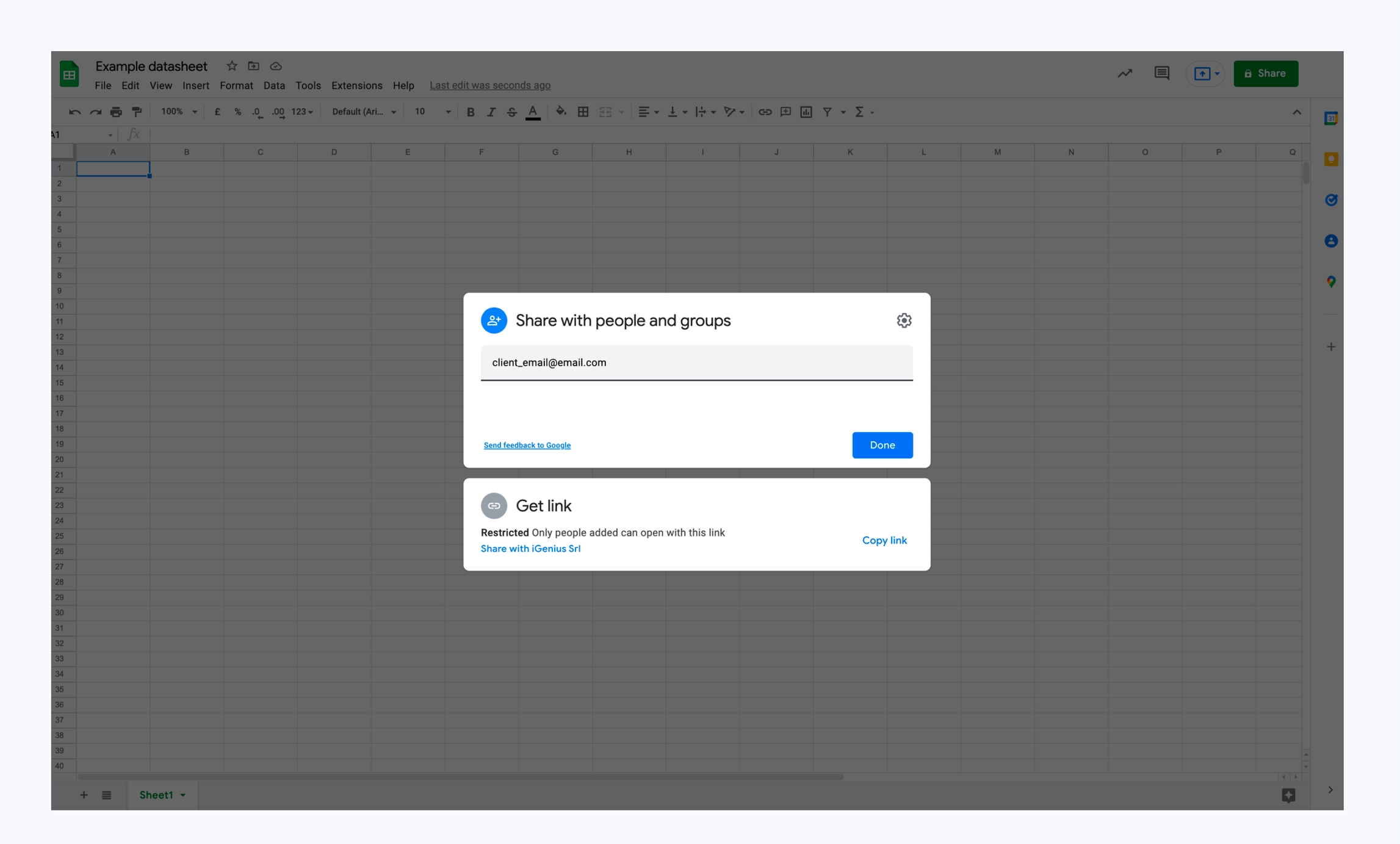 Per farlo, apri ogni foglio di Google Sheets che vuoi collegare al progetto di crystal, clicca su Share e inserisci il client email che puoi trovare nel file JSON.