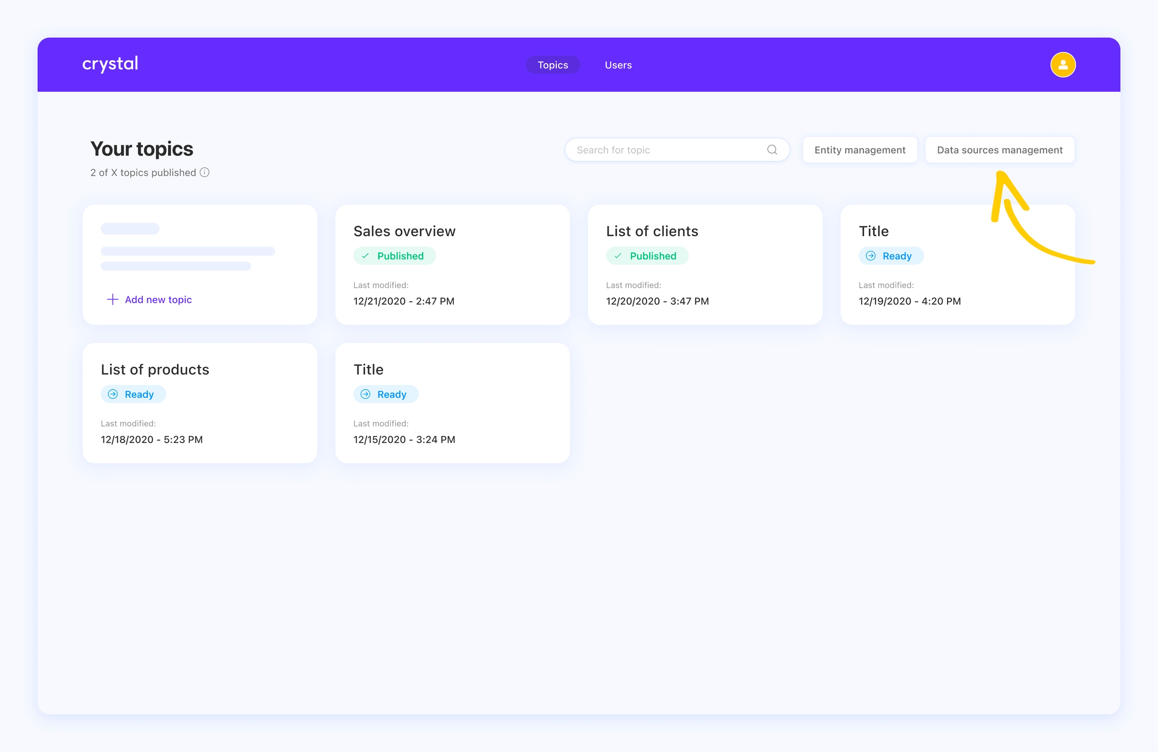 Una volta eseguiti i passaggi precedenti su Google Cloud Platform, è il momento di collegare Google Sheets al progetto crystal. Per farlo, apri la console Self-service e clicca su Data Source Management.