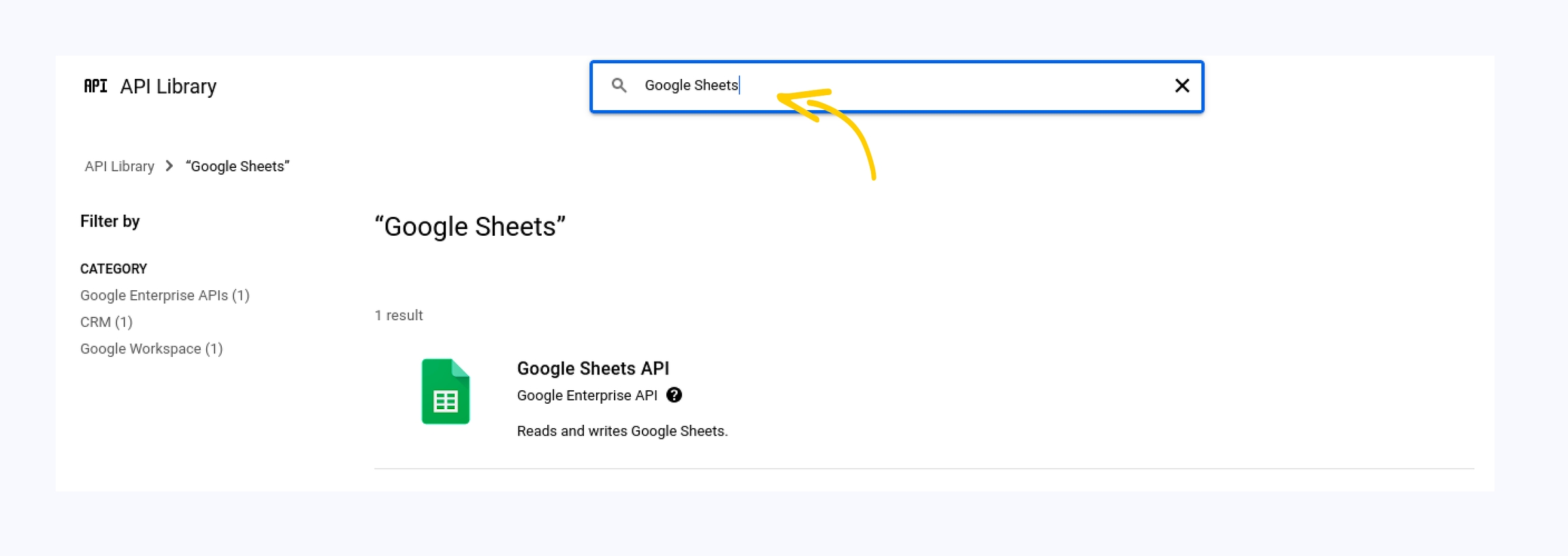 Nel menu aperto cerca Google Sheets e seleziona Google Sheets API.