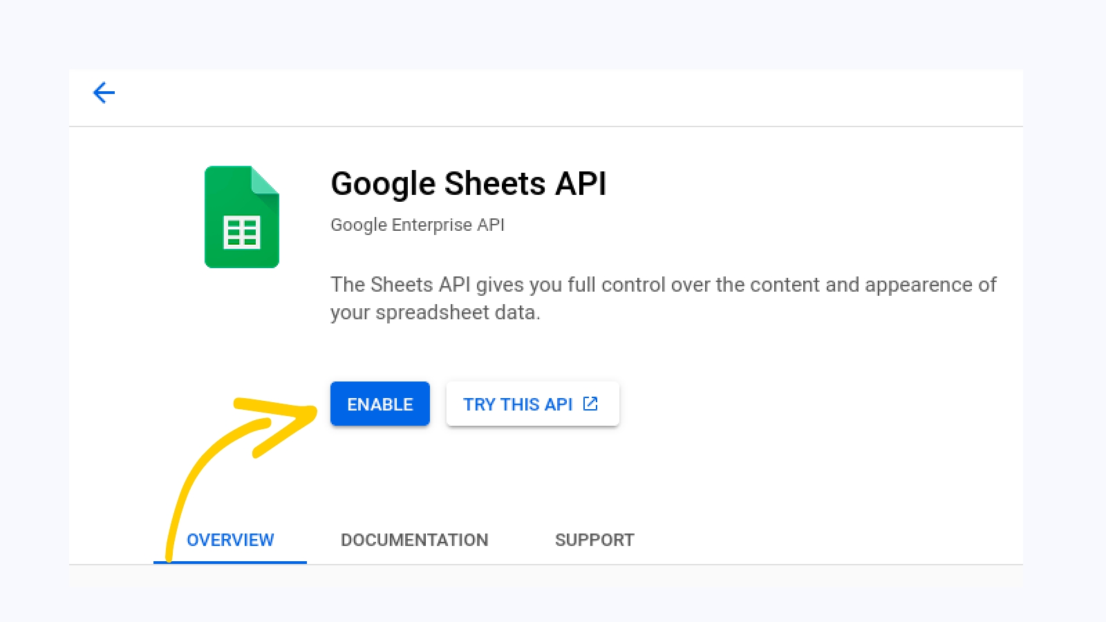Clicca sul pulsante Enable per attivare l'API di Google Sheets per il progetto corrente.