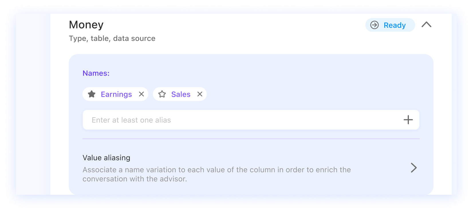 In questo step puoi impostare alias per colonne specifiche e vedere le domande che potrai chiedere all’advisor durante la conversazione. L’alias rappresenta il nome di una specifica colonna che puoi usare con crystal per fare domande su quei dati specifici.