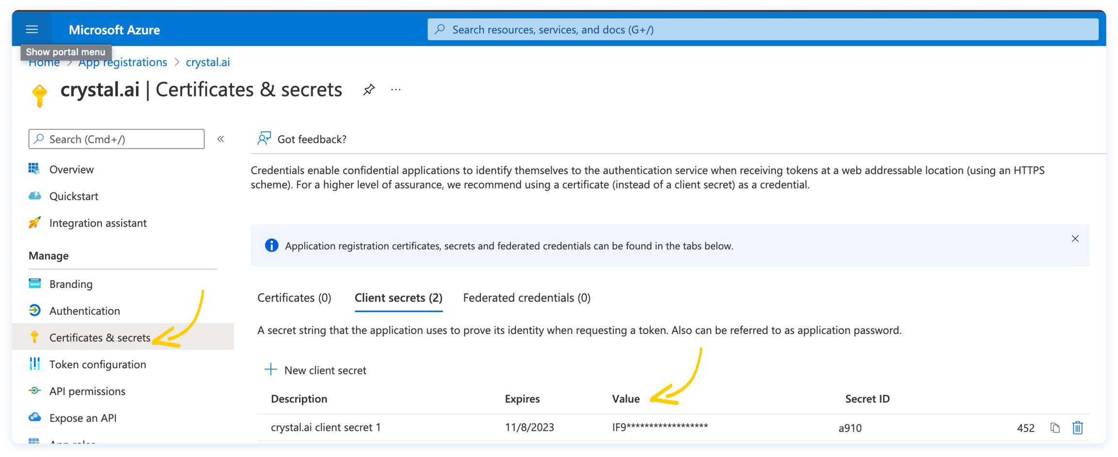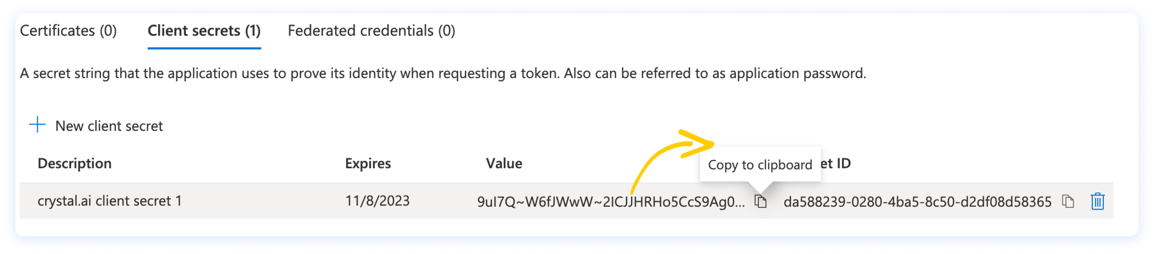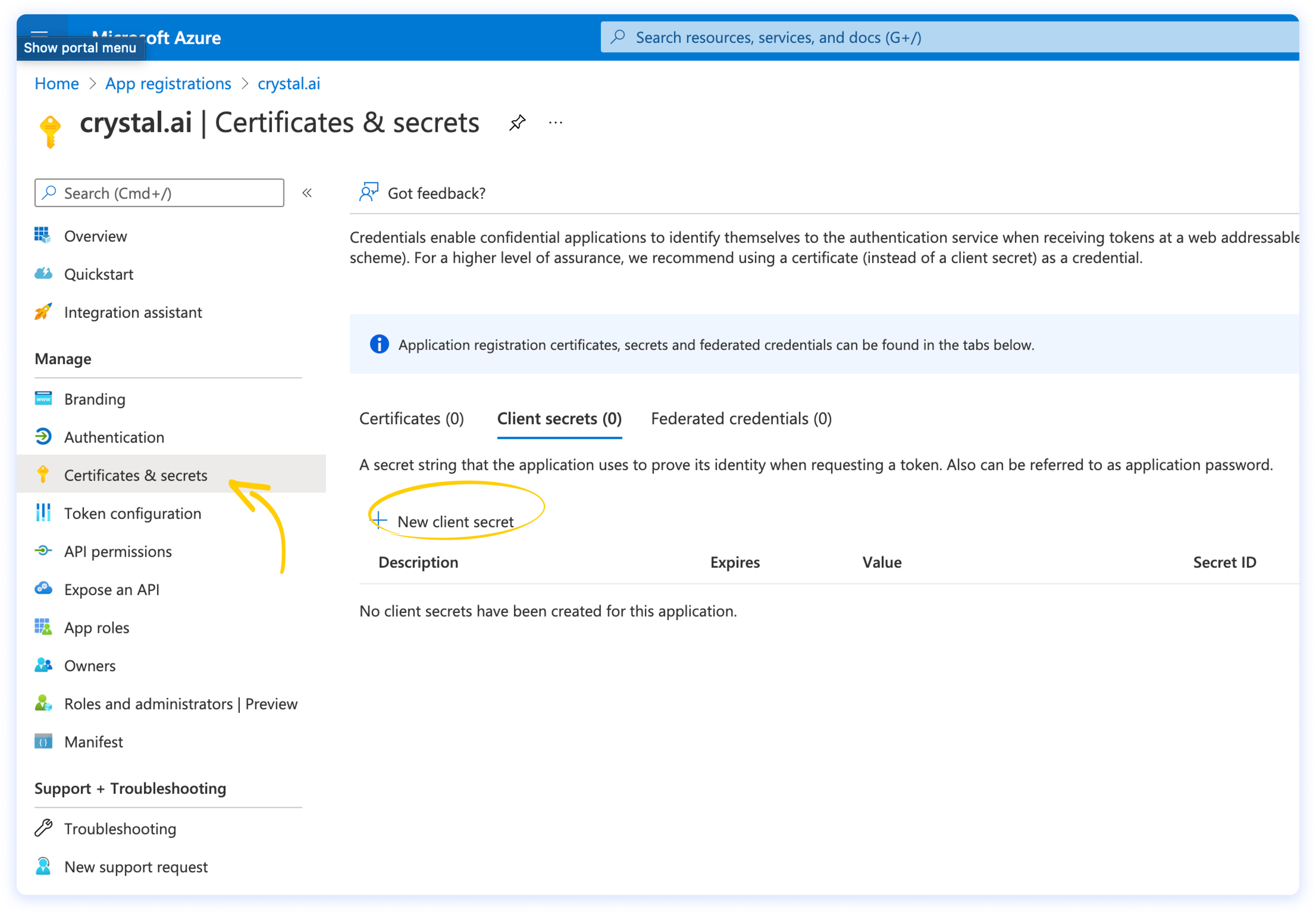 3. Il Secret Code si trova cliccando Certificates & Secrets dal menu di sinistra della tua registrazione crystal nel portale Azure. Se non lo hai salvato quando lo hai generato, dovrai crearne uno nuovo.