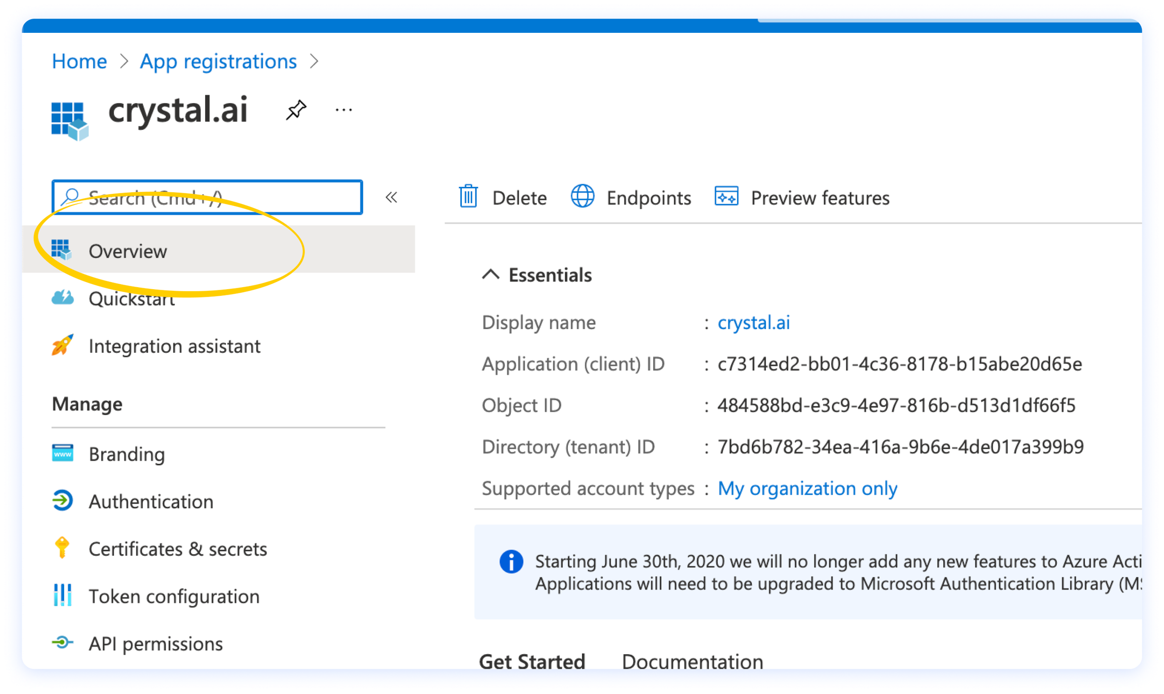 Client ID eTenant ID si trovano cliccando su Overview dal menu di sinistra della tua registrazione crystal nel portale Azure.