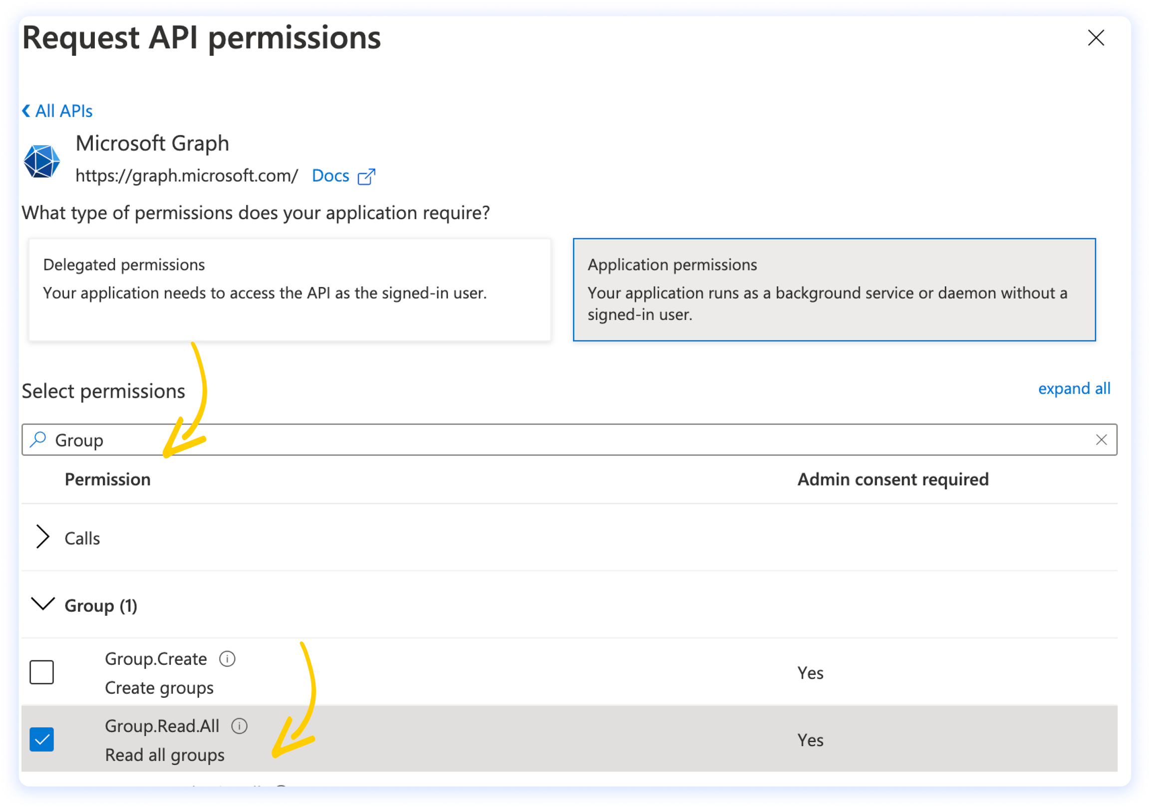 Clicca su Application permissions e cerca Group, quindi spunta l’opzione Group.Read.All permission.