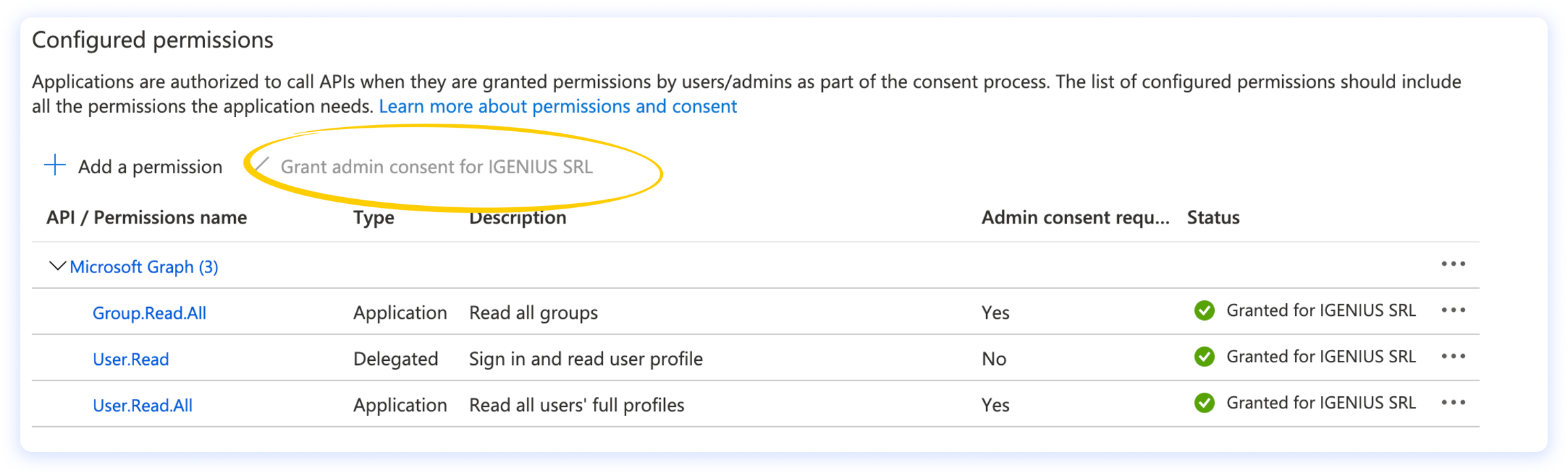 Se non sei l’amministratore della directory dovresti vedere un segno arancione sullo status al posto del pallino verde. In questo caso dovresti chiedere al tuo amministratore di autorizzare i nuovi permessi. Se sei l’amministratore puoi autorizzarli cliccando Grant admin consent for.