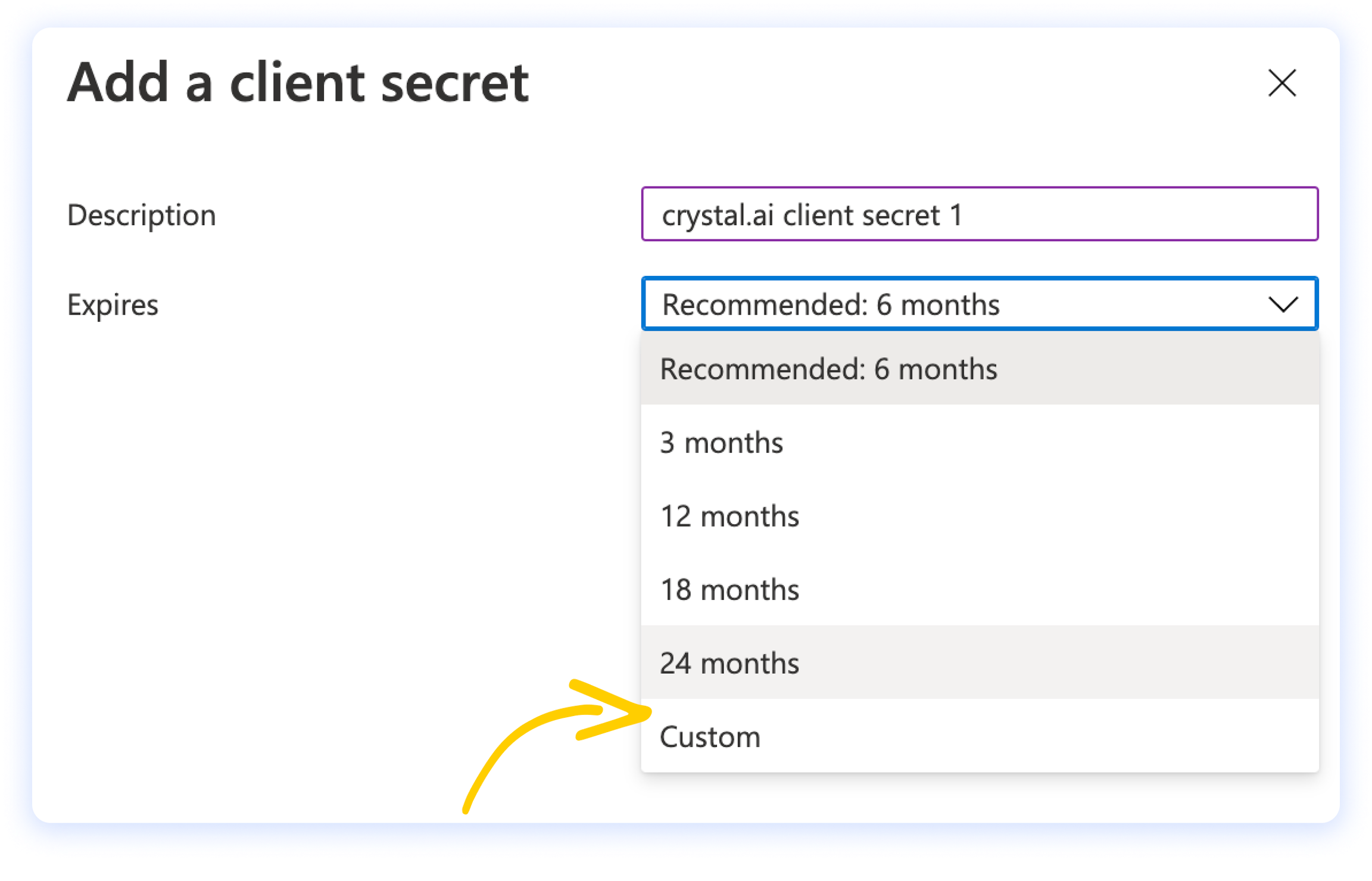 Ricorda che quando il client secret scadrà, dovrai riconfigurare crystal, quindi ti consigliamo di scegliere una durata Custom e di mantenerla abbastanza a lungo da non doverti preoccupare della scadenza.
