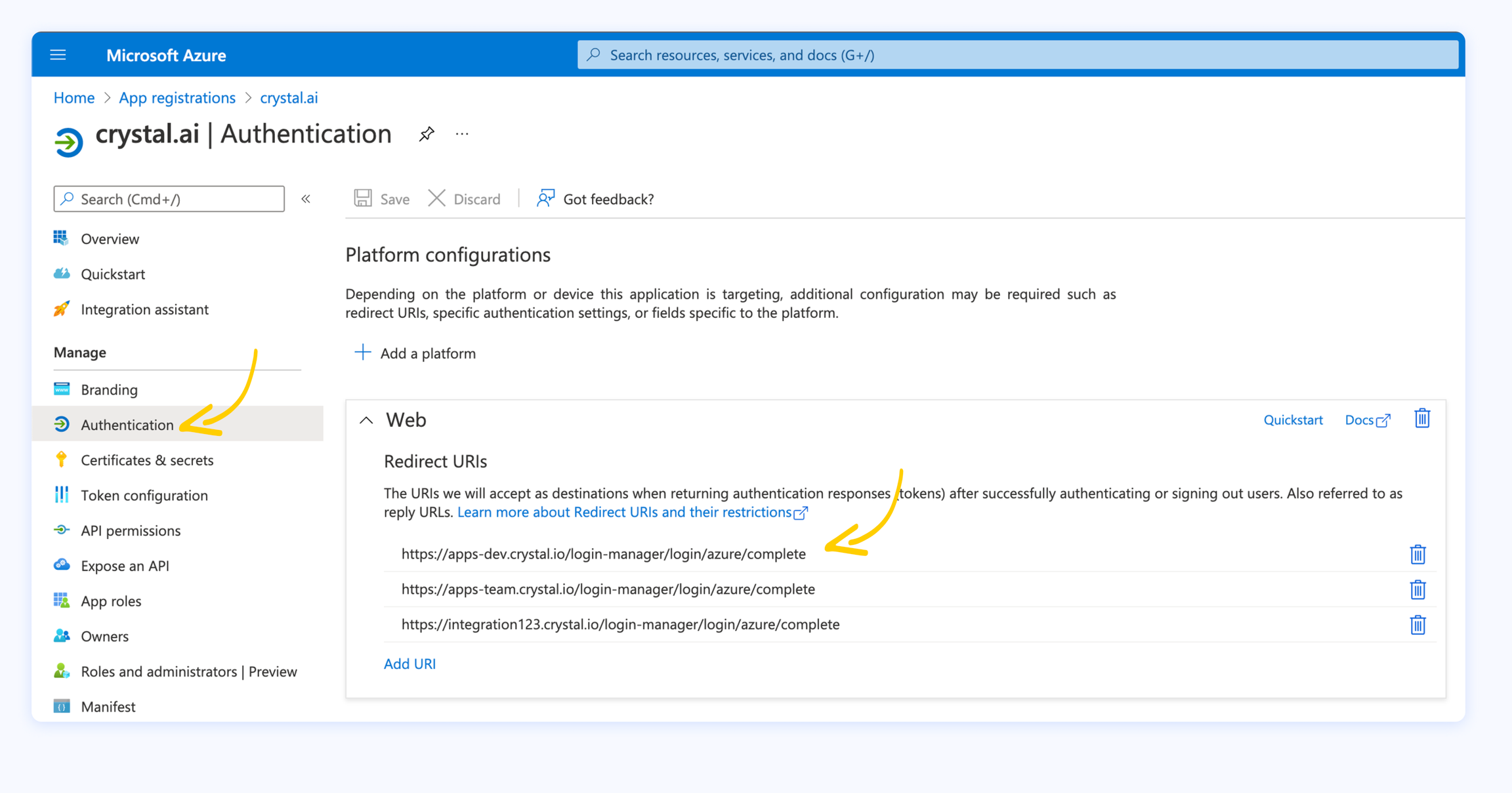 2. Il URI Redirect si trova cliccando su Authentication dal menu di sinistra della tua registrazione crystal nel portale Azure. Deve essere lo stesso e la struttura sarà la seguente: https://{your-crystal-tenant-name}.crystal.ai/login-manager/login/azure/complete.