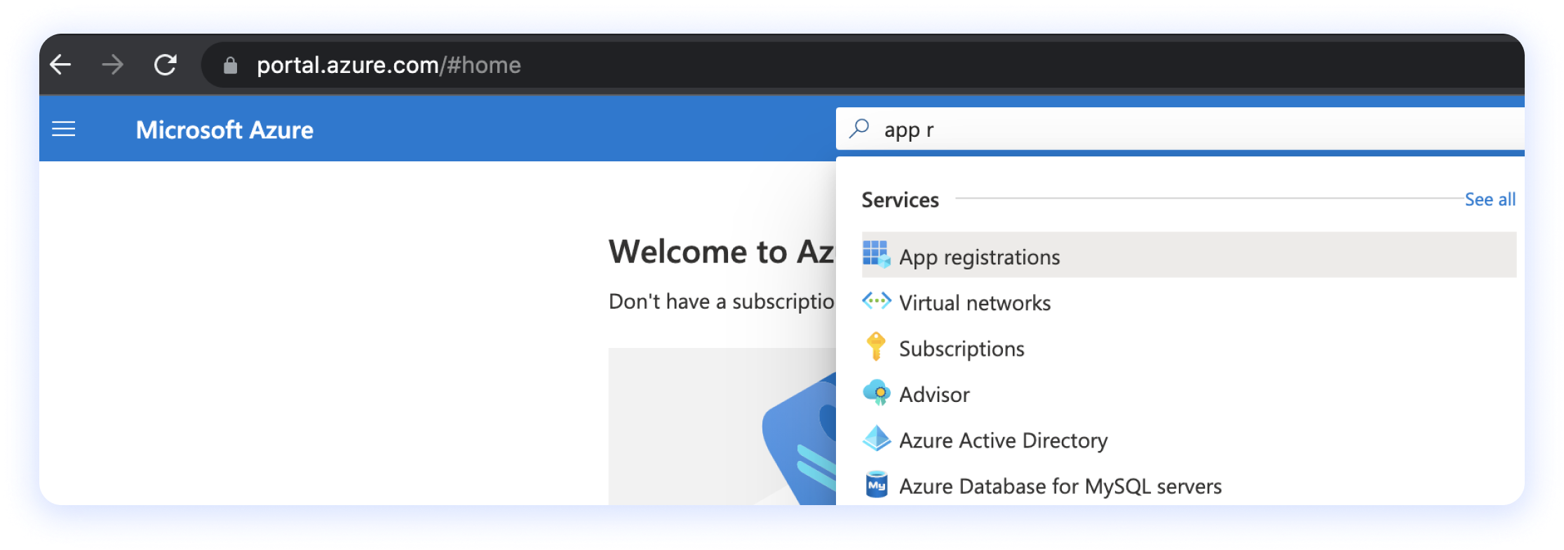 Quindi cerca App registrations nella barra di ricerca in alto.